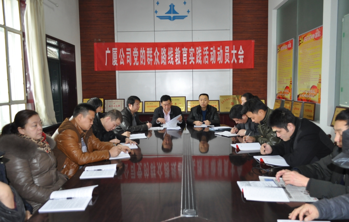會(huì )上,該公司黨支部書(shū)記游紅新首先傳達了集團公司黨委書(shū)記、董事長(cháng)馮立在集團公司黨的群眾路線(xiàn)教育實(shí)踐活動(dòng)動(dòng)員講話(huà)精神和集團公司關(guān)于開(kāi)展黨的群眾路線(xiàn)的實(shí)施方案。隨后對廣廈公司開(kāi)展黨的群眾路線(xiàn)實(shí)踐教育活動(dòng)進(jìn)行了動(dòng)員講話(huà),他要求:一是黨員干部要深刻認識開(kāi)展黨的群眾路線(xiàn)教育活動(dòng)的重大意義,講政治,講大局,改進(jìn)工作作風(fēng),堅決反對“四風(fēng)”著(zhù)力解決職工群眾反映的突出問(wèn)題,結合工作實(shí)際,積極投入到實(shí)踐活動(dòng)中。二是準確把握黨的群眾路線(xiàn)教育實(shí)踐活動(dòng)的總要求和目標任務(wù),以“照鏡子、正衣冠、洗洗澡、治治病”為總要求,進(jìn)一步提高思想認識,轉變作風(fēng),密切聯(lián)系黨群干群關(guān)系,樹(shù)立為民務(wù)實(shí)清廉的良好形象。三是緊緊抓好開(kāi)展群眾路線(xiàn)教育實(shí)踐活動(dòng)的重要環(huán)節,黨員干部帶頭學(xué)習,帶頭查擺問(wèn)題。黨支部副書(shū)記、經(jīng)理郭義昌傳達廣廈公司群眾路線(xiàn)教育實(shí)踐活動(dòng)第一環(huán)節計劃安排,重點(diǎn)做好“轉作風(fēng)點(diǎn)滴行”倡議實(shí)踐活動(dòng)。工會(huì )主席王文娟宣讀廣廈公司教育實(shí)踐活動(dòng)學(xué)習計劃。
