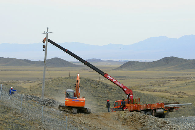 在137團阿吾斯奇牧場(chǎng),機聲轟鳴,只見(jiàn)三利公司水利施工部的挖掘機在山上挖山修路,華能公司的人員配合機械在立電線(xiàn)桿。