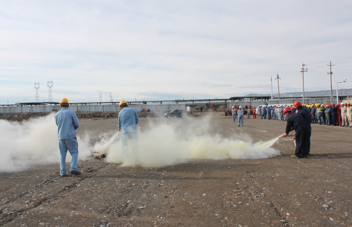 6月25號早晨八點(diǎn)半,北方建設集團獨山子公司組織產(chǎn)品罐區施工人員在天利實(shí)業(yè)輕餾分利用項目參加安全應急演練,演練分三個(gè)階段進(jìn)行,一階段正在作業(yè)的施工人員聽(tīng)到警報后,立即在HSE人員的引導下撤離施工現場(chǎng); 第二階段模擬現場(chǎng)有人觸電,現場(chǎng)電工立即切斷電源,并用干木棍挑開(kāi)電纜,其他人員用擔架將人抬至安全地帶.第三階段持滅火器進(jìn)行滅火,并由安全員進(jìn)行講解滅火器的使用方法。